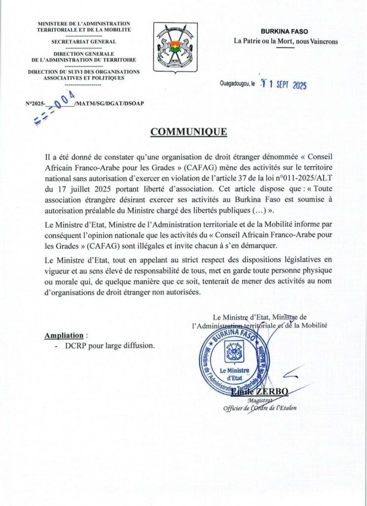 Le Ministre d’Etat, Ministre de l’Administration territoriale et de la Mobilité informe par conséquent l’opinion nationale que les activités du << Conseil Africain Franco-Arabe pour les Grades >> (CAFAG) sont illégales et invite chacun à s’en démarquer.