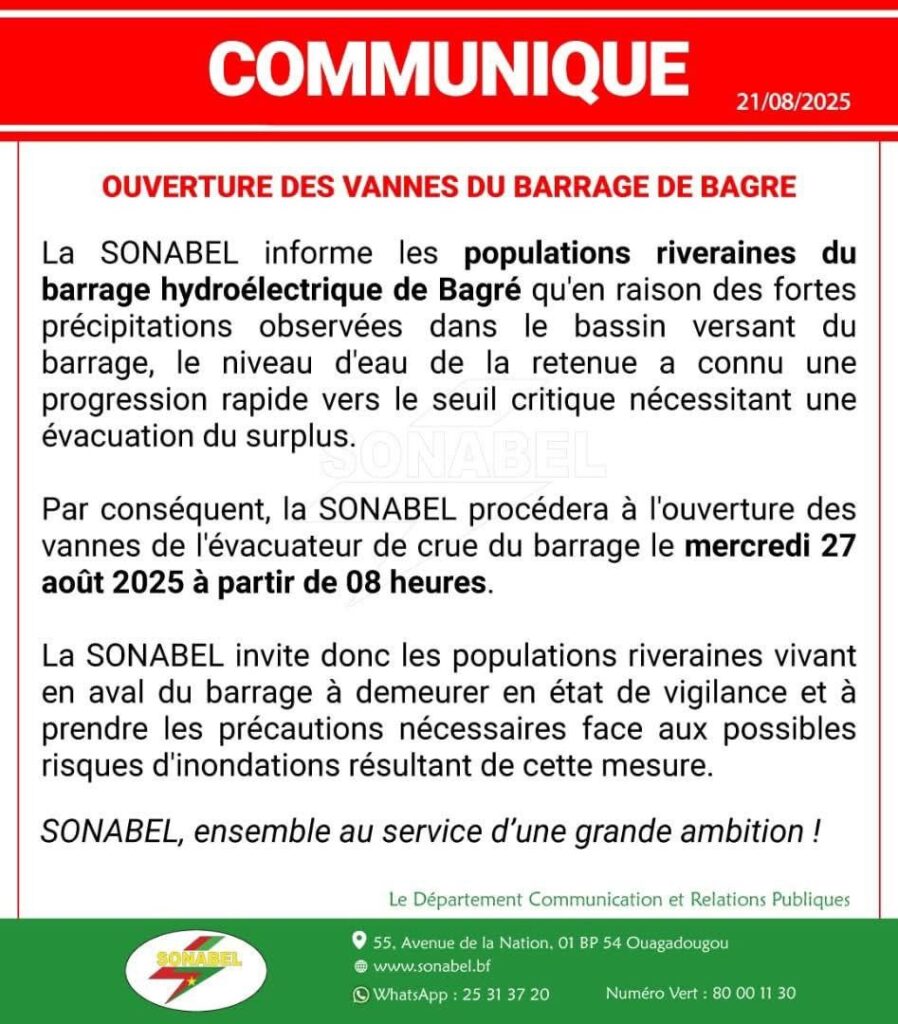 Par conséquent, la SONABEL procédera à l’ouverture des vannes de l’évacuateur de crue du barrage le mercredi 27 août 2025 à partir de 08 heures.
