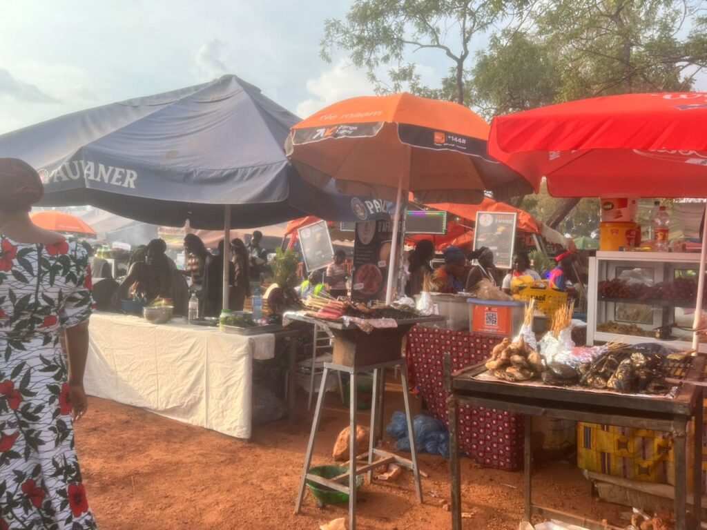 Sous un ciel légèrement voilé, visiteurs, commerçants et curieux se croisent dans une ambiance chaleureuse. Les allées de terre battue, bordées de tentes et de parasols aux couleurs vives, abritent une multitude d’activités commerciales et culinaires. Ici, chaque stand raconte une histoire, chaque produit reflète une facette du riche patrimoine burkinabè.