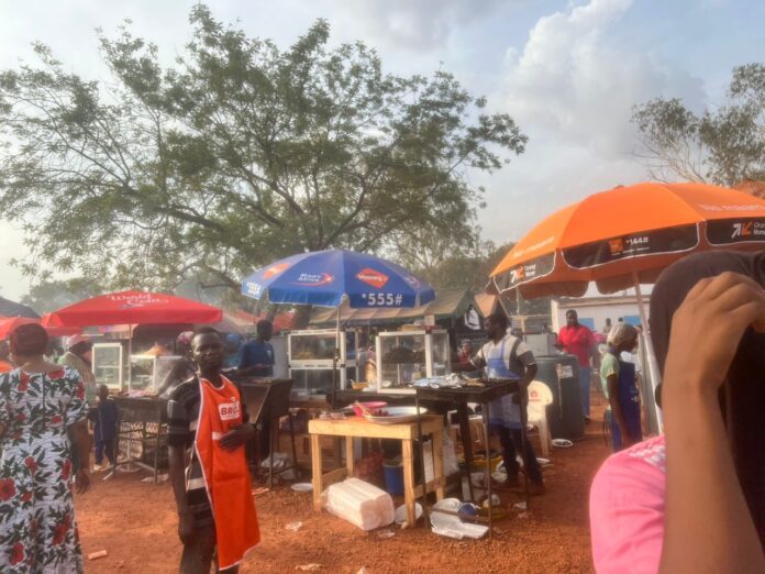 La gastronomie occupe une place de choix dans cette rue marchande. Des grillades fumantes aux mets locaux soigneusement préparés, les visiteurs sont attirés par les arômes alléchants qui flottent dans l’air. Brochettes, poissons braisés, fruits frais et boissons locales composent un véritable parcours gustatif, pris d’assaut par un public venu nombreux.