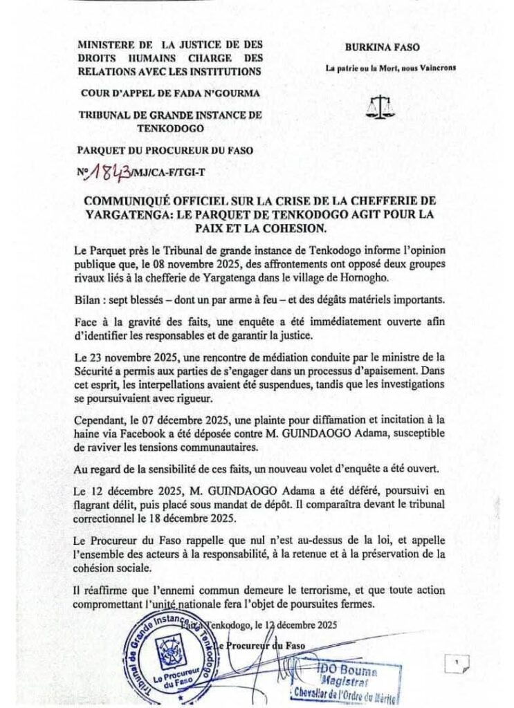Par un communiqué en date du 12 décembre 2025, le Procureur du Faso près le Tribunal de grande instance de Tenkodogo a informé l’opinion publique des suites judiciaires des affrontements survenus le 8 novembre 2025 dans le village de Hornogho, liés à un conflit de chefferie à Yargatenga.