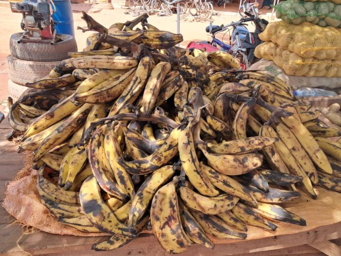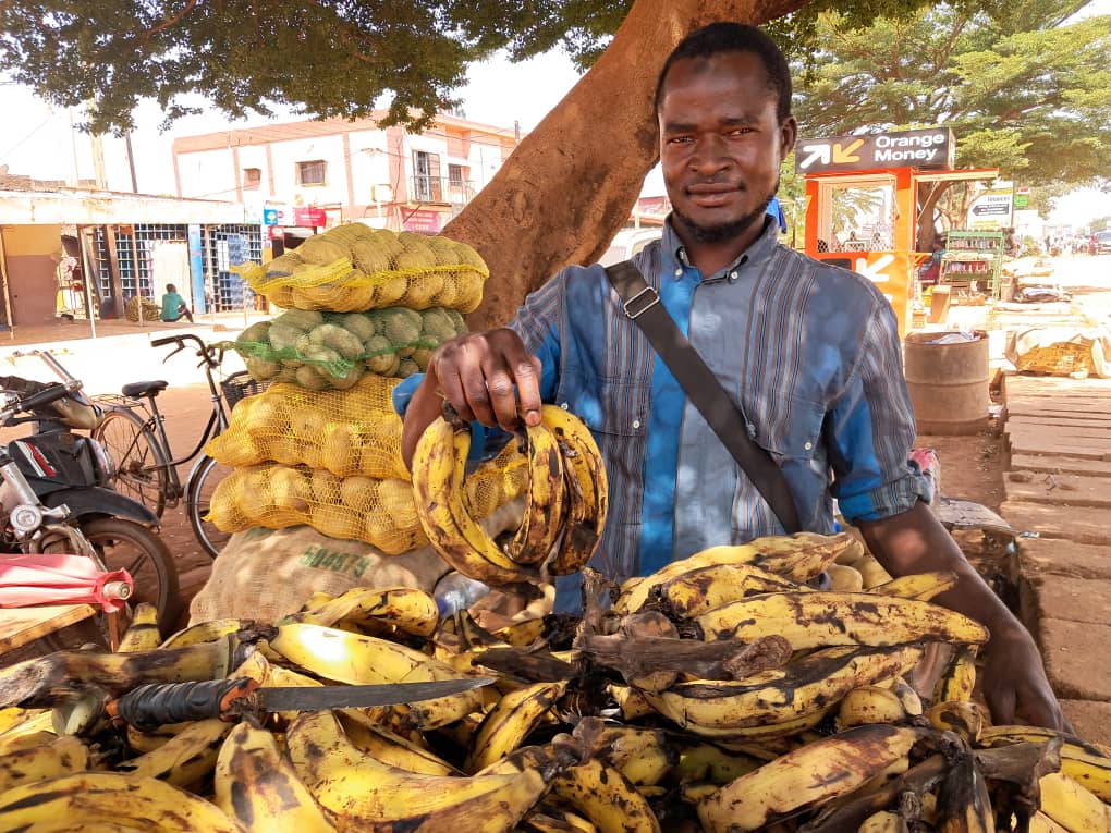 Sous un arbre, à quelques pas de la chaussée, Souleymane a installé son étal. Il est environ 10h, la circulation mouvementée sur ce tronçon fréquenté. Sur une table d’environ un mètre de long, sont disposées des bananes mûres dont le parfum embaume l’air. Âgé d’une vingtaine d’années, il s’active sans relâche : il trie, ajoute, et vend.